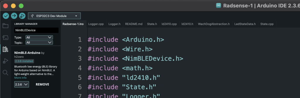 - Open the file “Radsense-1.ino” by double-cliking it. This should open the Arduino IDE with all the required files.